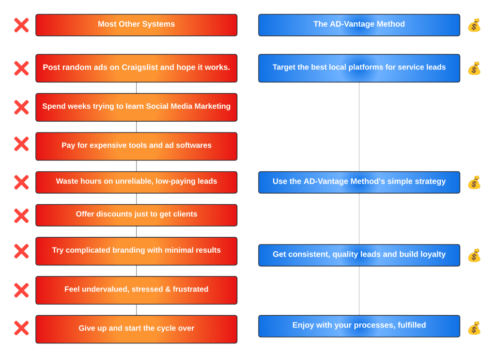 This system is unlike anything you’ve ever tried for your service business. No more posting random ads, spending on ineffective marketing, or chasing down clients who don’t value your work.
